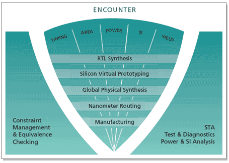 作為一個整合 RTL 到 GDSII 設計的環境,Encounter 平臺提供一個完整的測試流程 — 從 RTL 合成與測試設計,再到通過晶片的 prototyping 跟分區,最後到時脈分析以及下製程參數,此平台可協助工程師完整設計出高品質晶片(時間、區域和電源與導線),並能以準確的驗證結果、信號完整性、最新良率及低功率設計驗證能力來完成 65 奈米等級的應用。Encounter 可協助您提高生產力與處理複雜設計的能力,進而讓產品快速上市。
